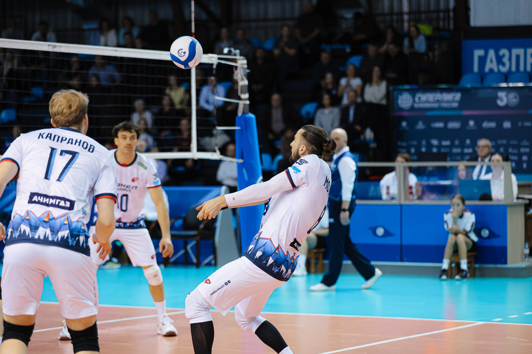 Так команды вошли в равную концовку, где гостям удалось отыграть пять сет-болов. Съем у «Факела» шел успешно, но риск на подаче привел к четырем ошибкам в этом элементе. Последнюю совершил Мозжухин (29:28). Родичев укоротил подачу, чем затруднил доводку, Капранова зацепили блоком на высоком мяче и Никифоров закончил сет, 30:28.
