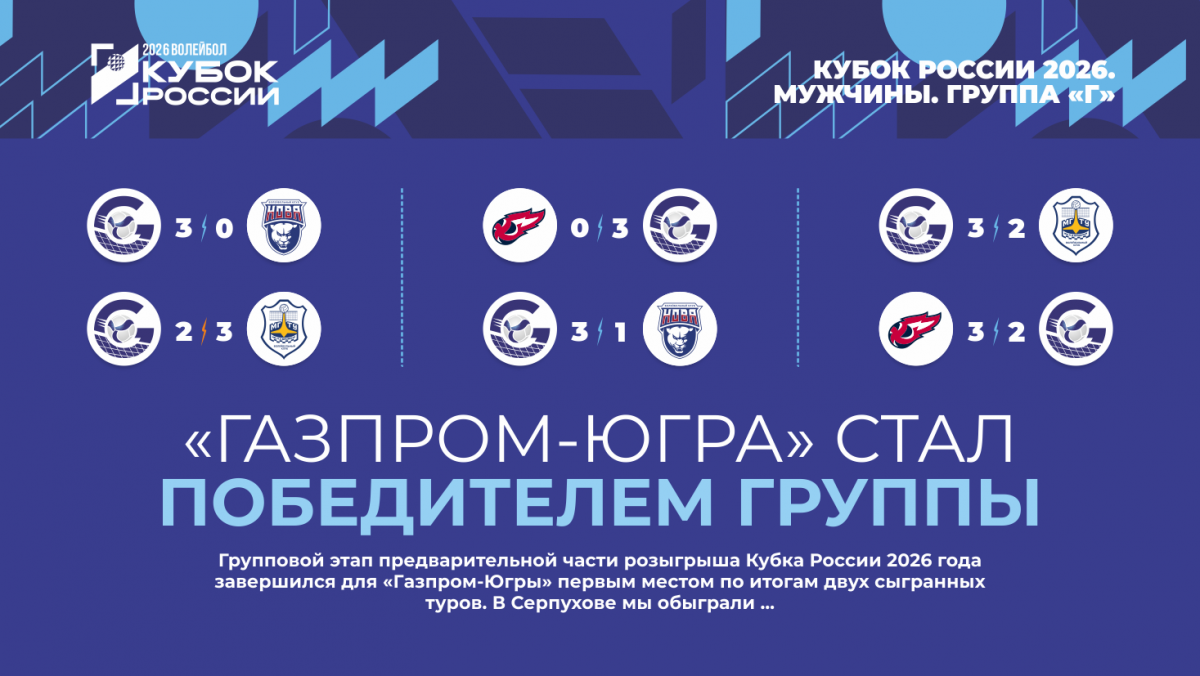 Групповой этап предварительной части розыгрыша Кубка России 2026 года завершился для «Газпром-Югры» первым местом по итогам двух сыгранных туров. В Серпухове мы обыграли «Нову», 3:1, а затем вместе с МГТУ и «Факелом» закрутили карусель из пятисетовых встреч, где каждый одержал по победе. Одержав верх над МГТУ, «Газпром-Югра» обеспечил себе первое место еще до матча с «Факелом», что позволило провести ряд любопытных и полезных экспериментов в последней игре.