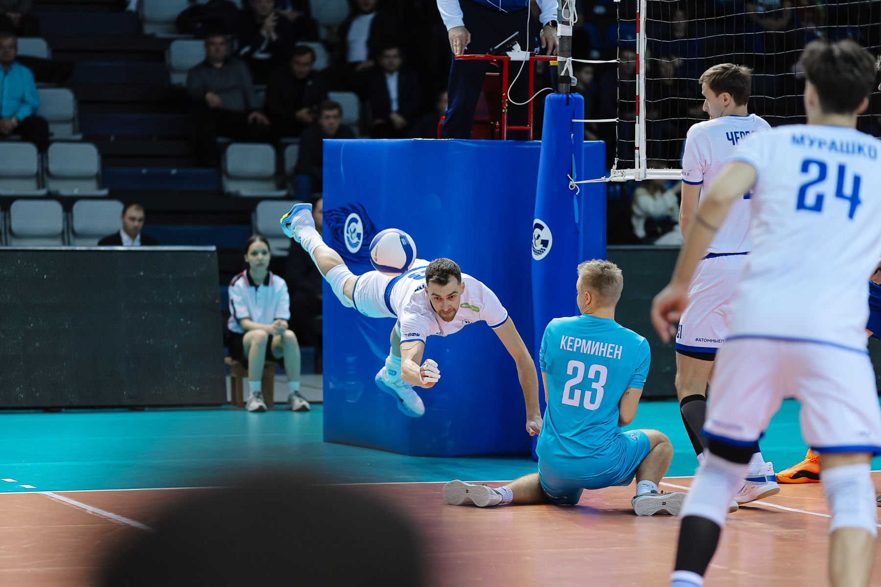 Панов чуть-чуть не укладывает мяч четыре по четыре, Родичев прихрамывает в атаке, Мурашко по темпу обыгрывает скидкой блок, мощно подает и доигрывает, а затем оформляет чистый эйс,16:18. Сургутяне держатся в кильватере благодаря подаче Панова и атаке Юринского, но именно Павел на обыгрывает блок на сетболе, 23:25.